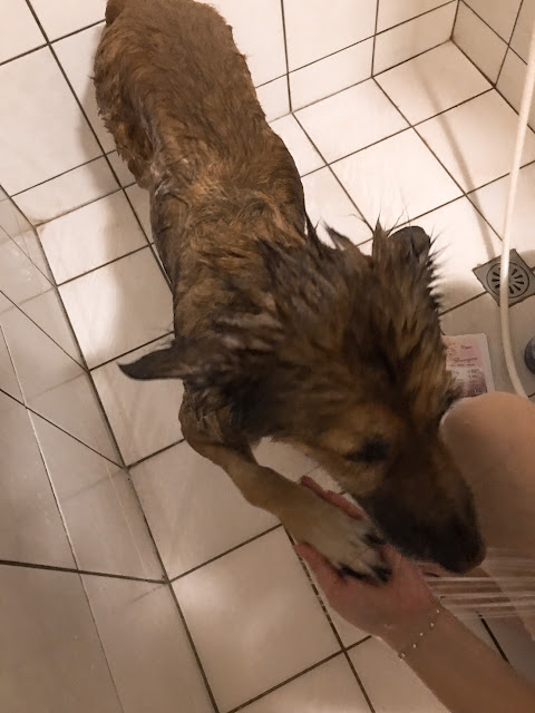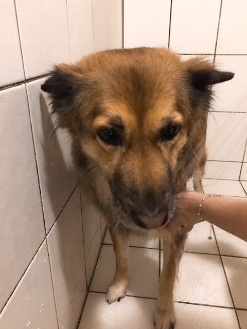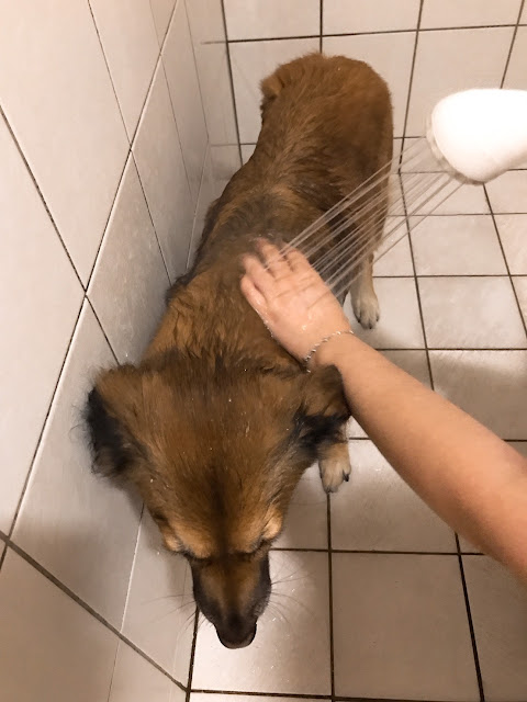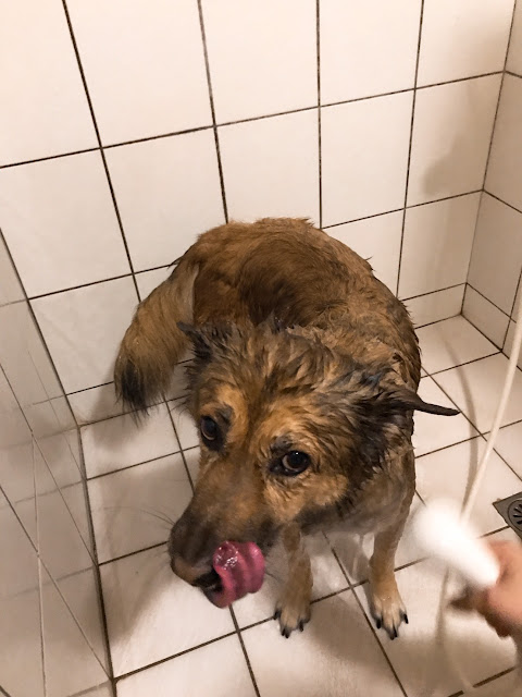 一樣從打溼毛毛開始,不曉得是不是因為這幾週洗得比較勤,水很容易就把阿茶厚重的雙層毛打濕了,不像之前一樣一身灰需要沖很久,阿茶看起來也鎮定多了,看來Sipet洗毛精給牠的印象還不錯,不會覺得沐浴乳很令狗抗拒~
